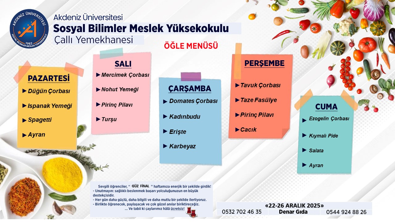 15-19 Aralık 2025 | Çallı Yemekhanesi Haftalık Yemek Listesi Eklenme tarihi: 6.10.2025 11:59:11 Son güncelleme: 24.12.2025 10:18:35